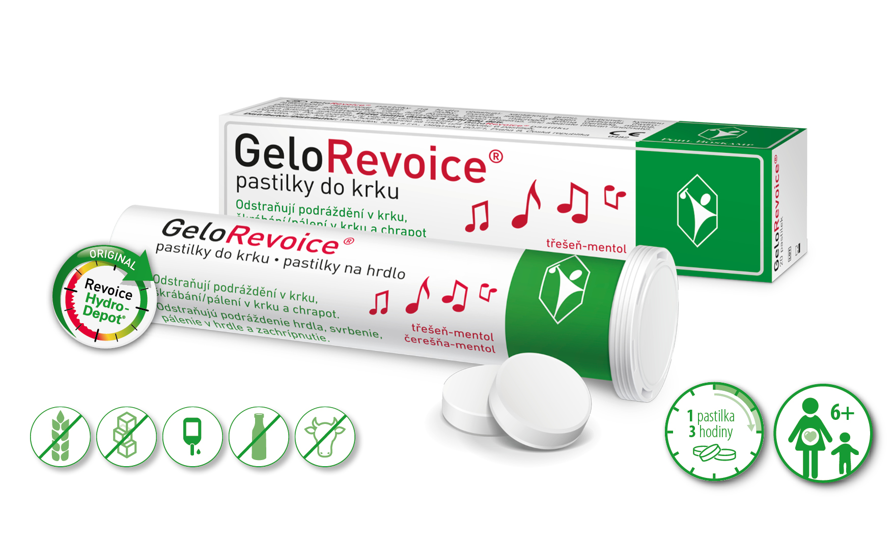 GeloRevoice® pastilky do krku chrání sliznici úst a krku. Používají se k odstranění příznaků, jako jsou chrapot, škrábání/pálení v krku a suchá sliznice, které způsobují bolest v krku nebo dráždivý, suchý kašel.